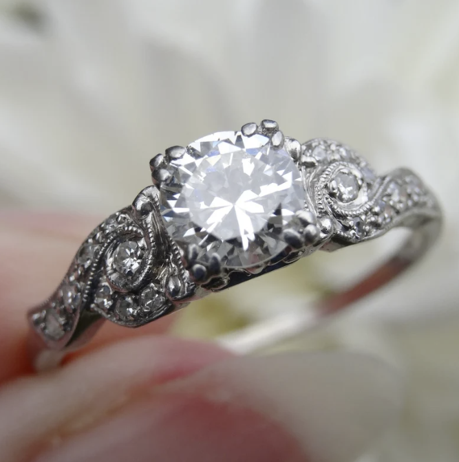 Art Deco diamond ring in platinum, .92ct transitional cut diamond. Click here to purchase and to view other similar items for sale.