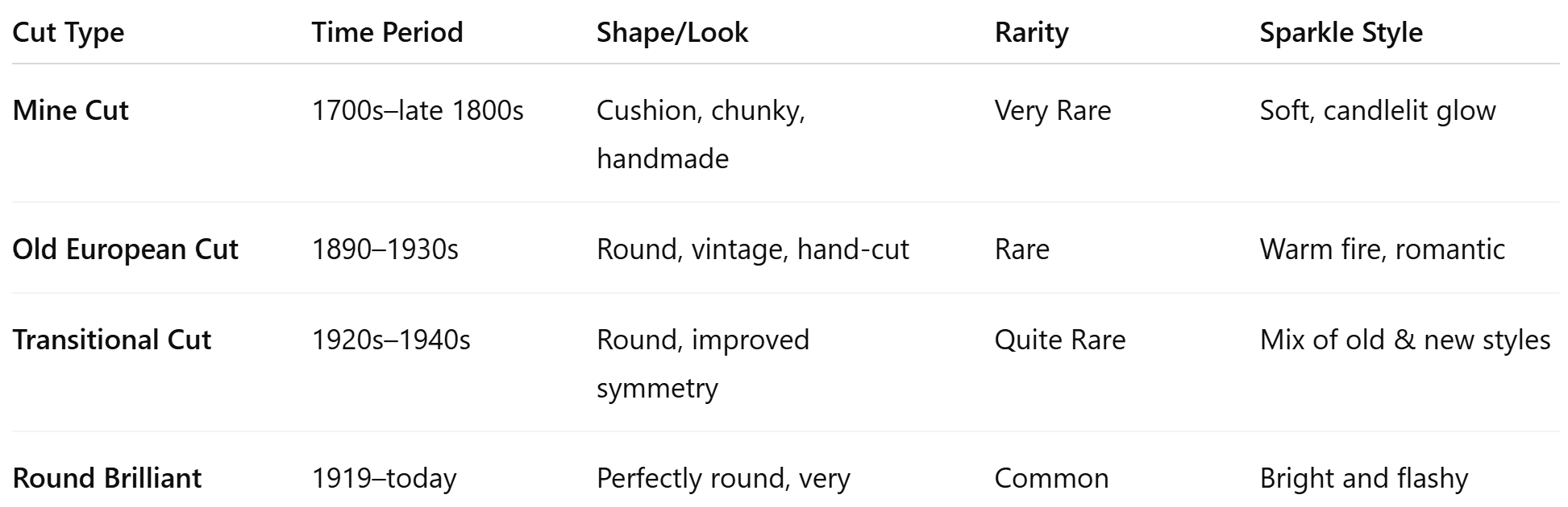 This cut is a “bridge” between antique diamonds and modern ones. You can still see hints of vintage style, but the light performance is closer to what you’d expect from today's diamonds.