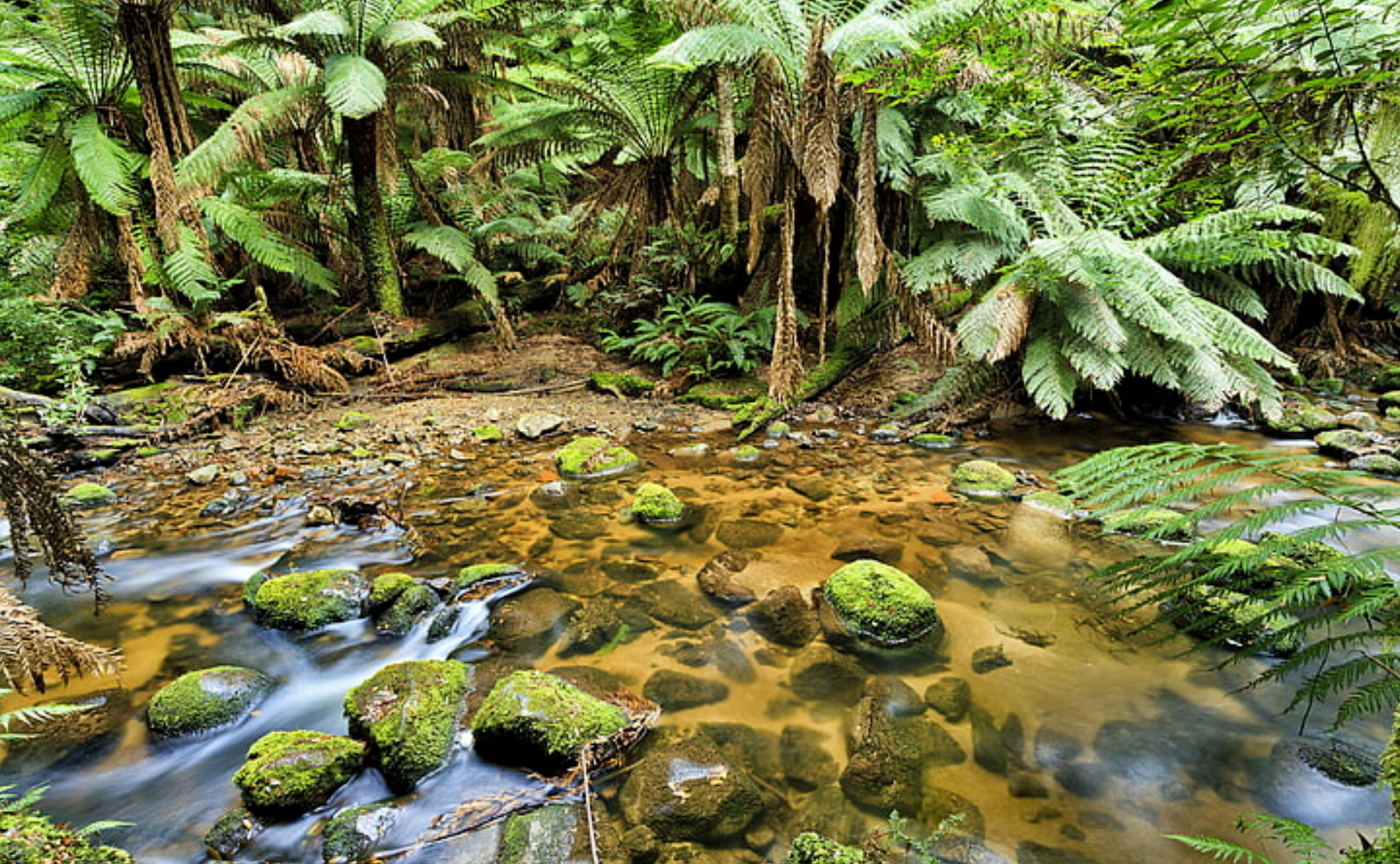 A fern-lined creek with mossy rocks and hidden treasures below.